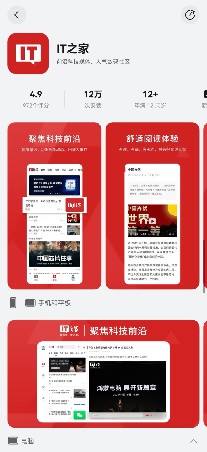 IT之家10月14日消息,华为在鸿蒙HarmonyOS5系统上,为应用市场AppGallery提供了一项全新功能,让其可以展示当前应用已适配的设备类型,包括手机、平板、电脑、手表等。