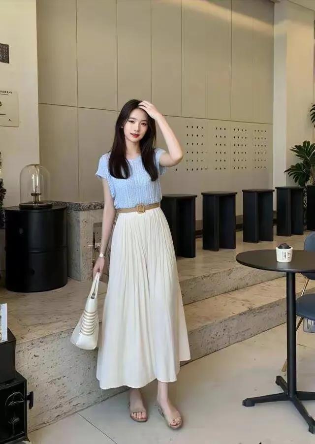 如果想呈现出一种御姐的穿搭效果,可以像下面这位达人用浅蓝色的针织上衣搭配上白色的百褶半身裙,穿的时候把上衣的衣角塞进裙子里面,再勒上腰带就能很好的提升腰线,而且这样的穿衣造型有一种女人味和温柔感,会让穿搭的看起来更加迷人。