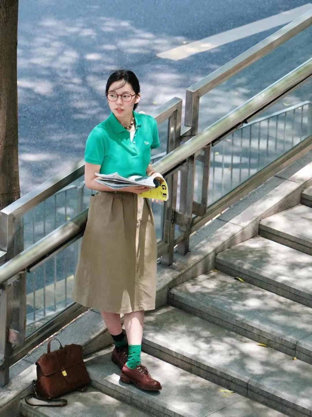 身材丰满或者是微胖女性,可以选择小宽松的绿色POLO衫,搭配上高腰收腰款的卡其色工装半身裙,脚上穿了一双棕色的皮鞋和绿色的短袜,这一身穿衣配色也很大胆,同时也不失时尚感。