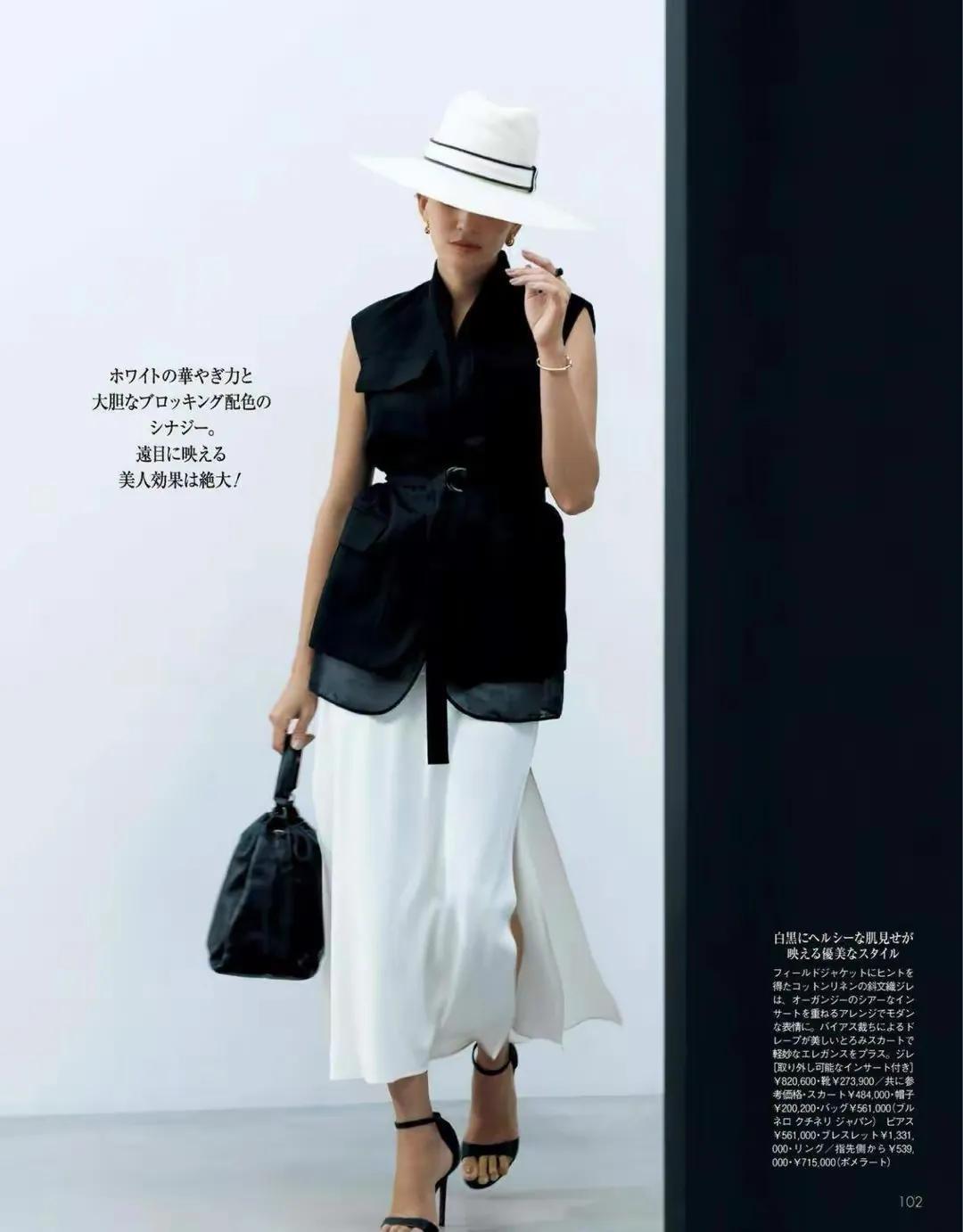 当然,虽然选择黑白两个经典色调组合,确实能降低出错率,但并不能意味着穿出时髦感,因为能影响整体专业风格走向和气质的,还有衣服版型、材质、款式,例如下面用一件拥有高腰收腰设计的黑色马甲上衣,搭配上白色的半身裙和一款白色的大檐帽,这一身穿衣打扮就很适合骨架比较大的女性穿搭,散发出来的气场特强,有一种成功企业女强人的视觉效果。