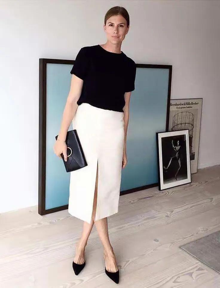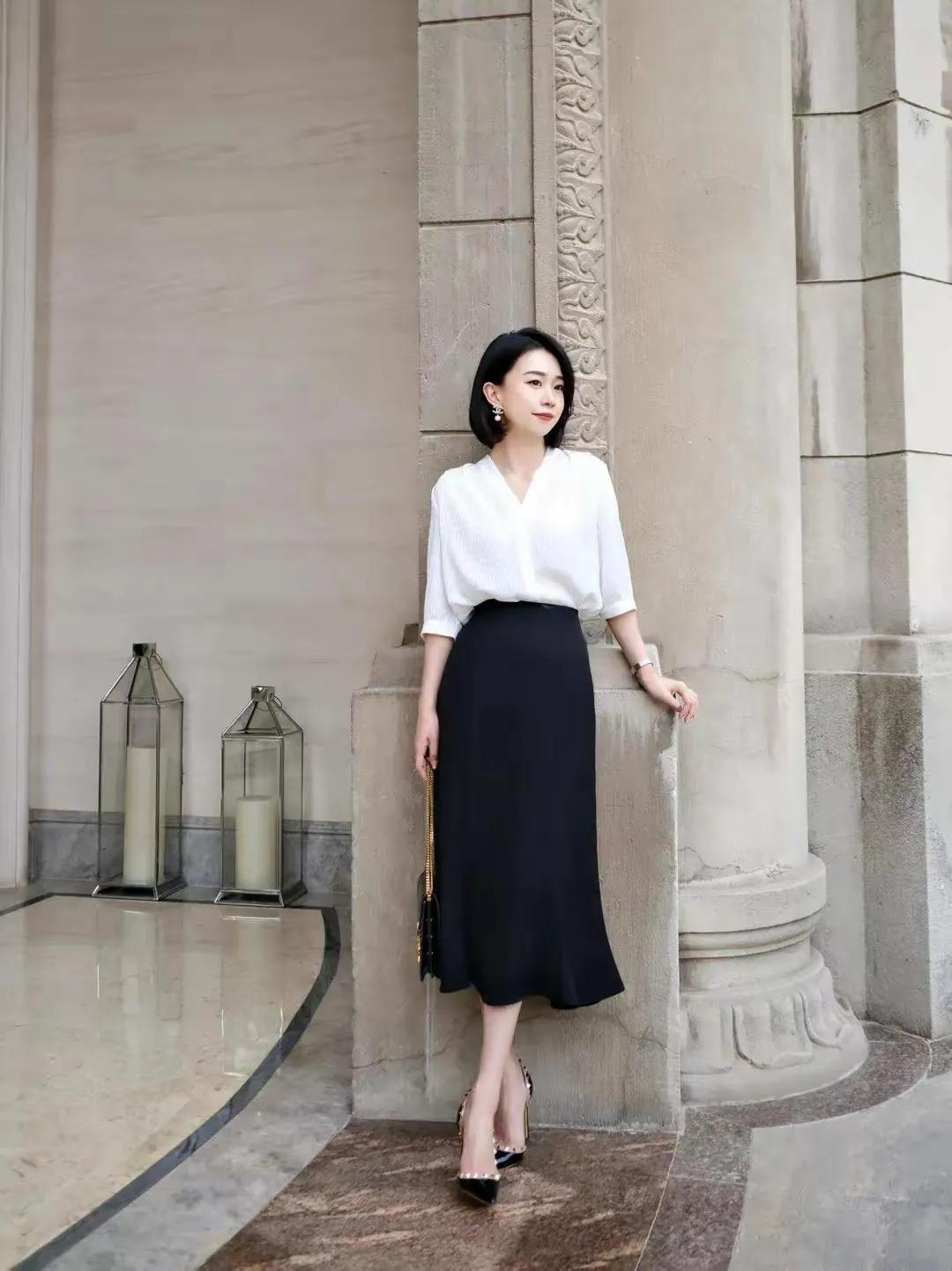职场女性选择黑白灰三种色调穿搭的最多,原因很简单,黑白的衣服穿在身上之后,能够展现出你的气场,显得整个人成熟稳重又大气,例如下面用一件白色衬衫搭配黑色的半身裙就有了以上所述的效果