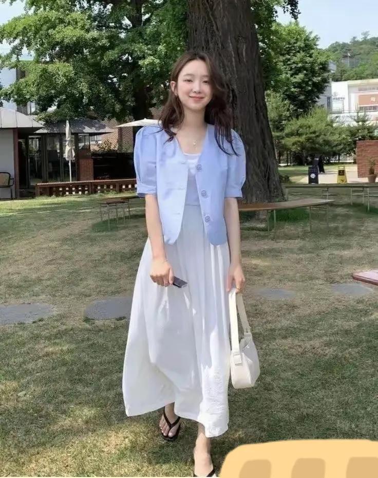 小个子女生的话,那可以学习一下,下面这位女生的穿搭,一件小短款的浅蓝色外套搭配上白色的半身裙,脚上穿着一双黑色的凉拖鞋,这样的穿衣打扮属于上短下长的搭配技巧,能更好地提升你的腰线,这样就能更好的优化身材线条比例,让穿搭者变得显高显瘦。