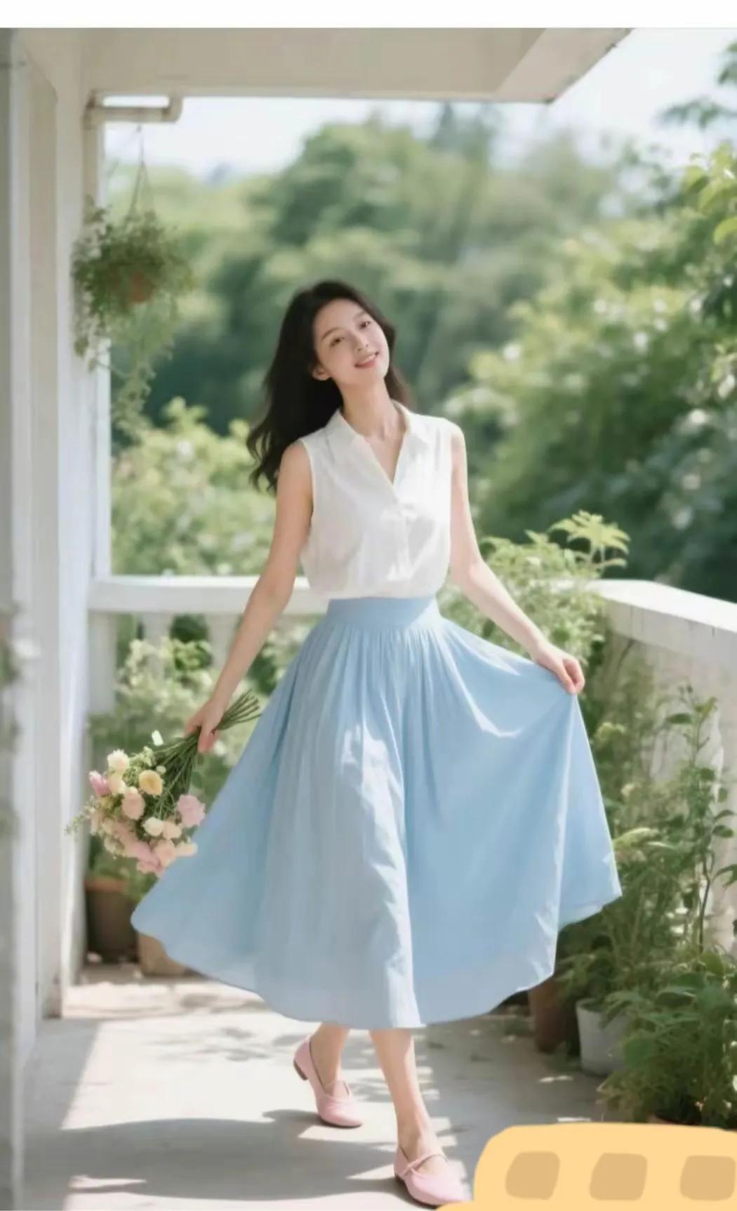 有的时候你觉得黑白颜色搭配会过于沉闷,那么你还可以选择像下面这种浅蓝色的伞状半身裙来搭配上白色的衬衫,再加上一款粉色的浅口单鞋,这样的穿搭确实能使得穿搭者变得更加年轻貌美。