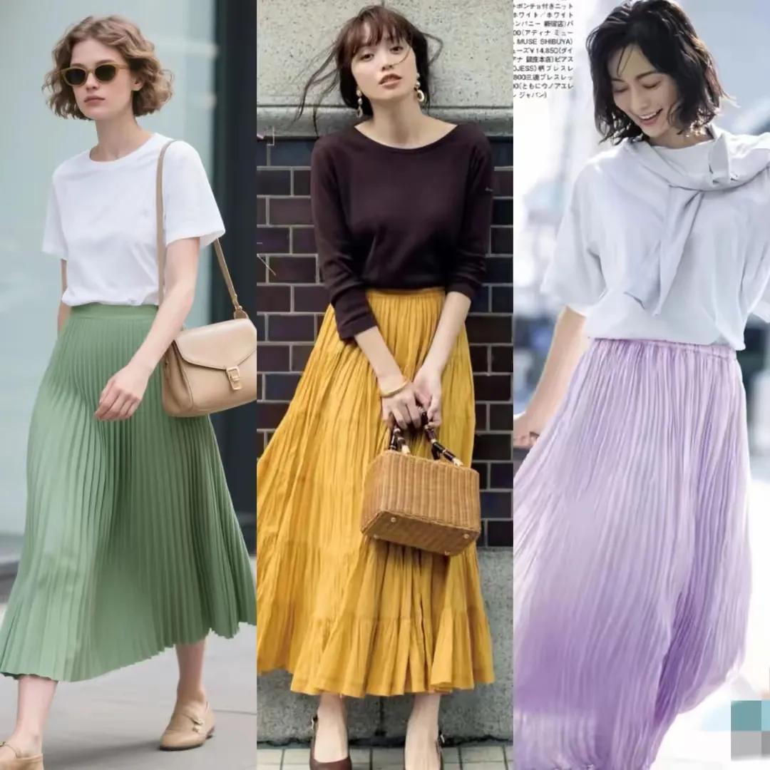 例如下面这3套穿搭都是有彩色的裙子来搭配,虽然颜色很靓丽,但穿在身上之后没有任何违和感,也没有装嫩的嫌疑,这样的创意拍摄确实惹人喜欢。