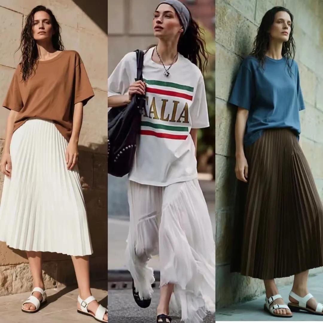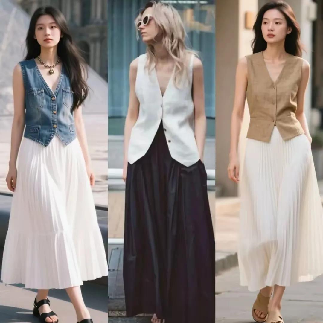 当我们看到这里,大家有没有发现其实整套穿衣配色不会超过三个色调,比如下面用白色的马甲搭配黑色的半身裙,黑白穿搭显得比较成熟稳重,也可以用比较时髦的蓝色牛仔马甲搭配白色的白色半身裙,或者是卡其色的马甲搭配上白色的百褶半身裙,这两套穿衣打扮配色都显得很高级,而且洋气。