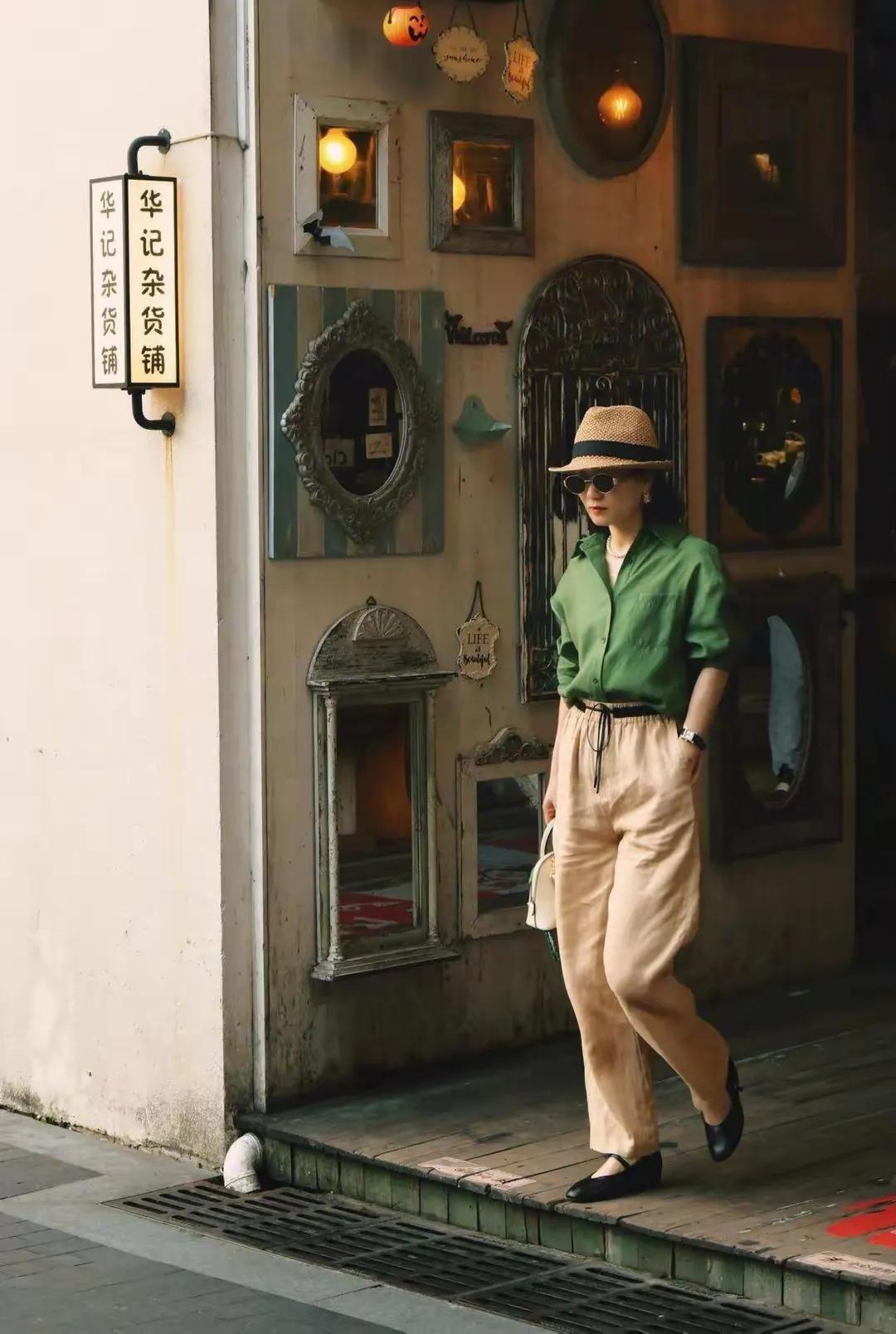 骨架比较大的女性个子比较高,们可以用微宽松的绿色衬衫上衣,下半身选择卡其色,大地色的休闲阔腿裤,脚上穿的黑色的玛丽珍鞋,头上戴了一款草帽,这一身穿一大半,不光很大气,同时有一种休闲感,日常穿搭在适合不过了。
