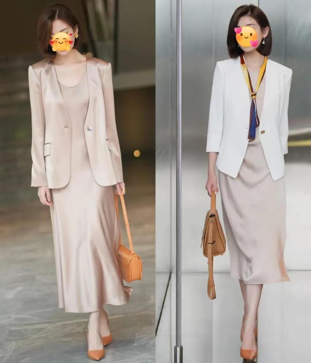 其实,还蛮推荐大家选择大地色系的衣服裙装来穿搭的,这个颜色穿在身上之后,让你看起来更显贵,例如,下面这两套穿搭用的就是大地色系的裙装来搭配上西服外套,呈现出了效果显得比较干练,而且优雅。
