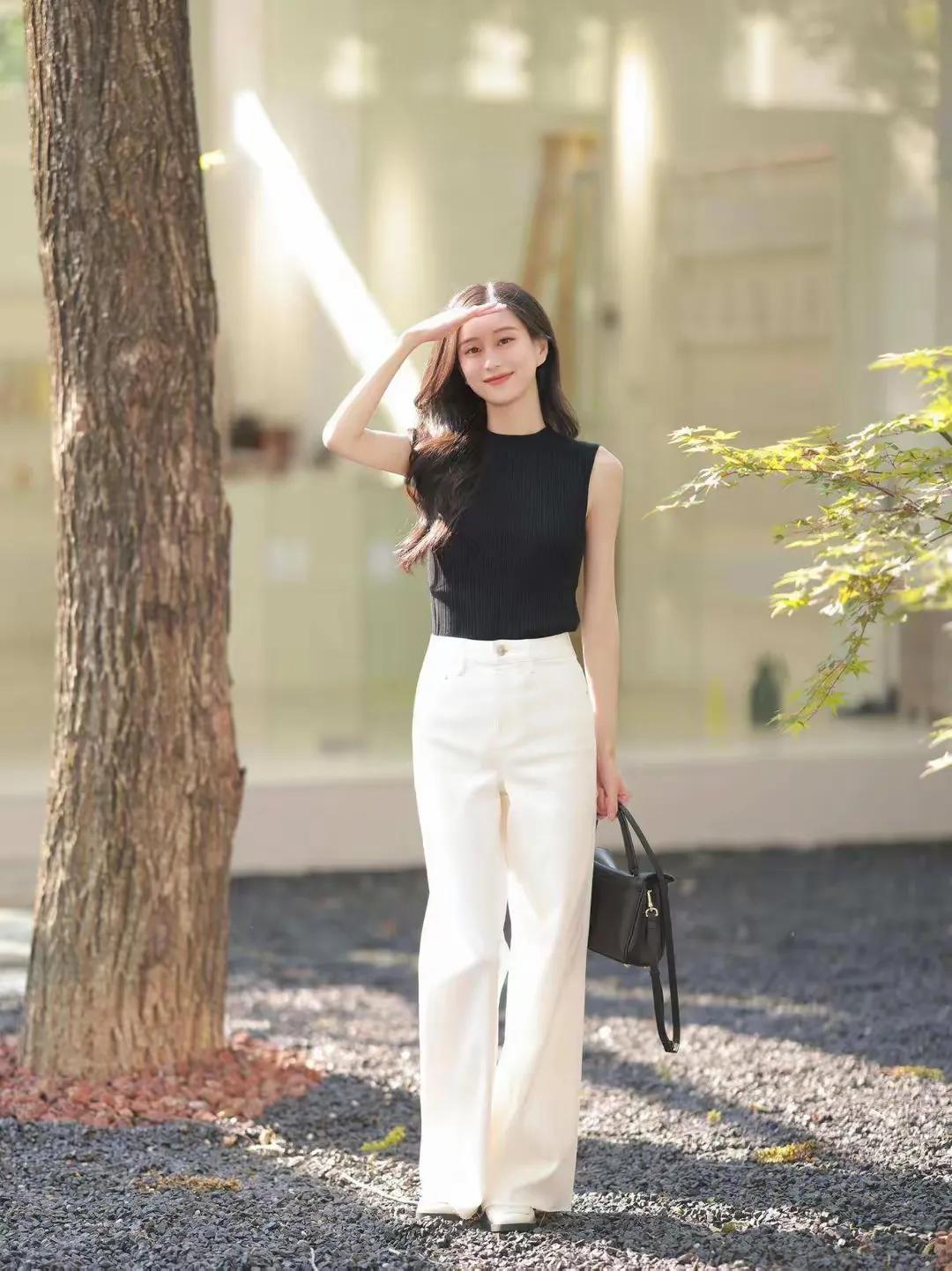 我们如果想让自己看起来更加显高显瘦,也可以用修身款的黑色无袖上衣搭配上白色的阔腿长裤,这样的松紧结合穿搭能更好的展现出你凹凸有致的身材,本身黑色的上衣就很遮肉显瘦,在和白色的阔腿裤组合在一起,呈现出来的效果,通勤大气,穿去上班,逛街,约会都没有任何问题。