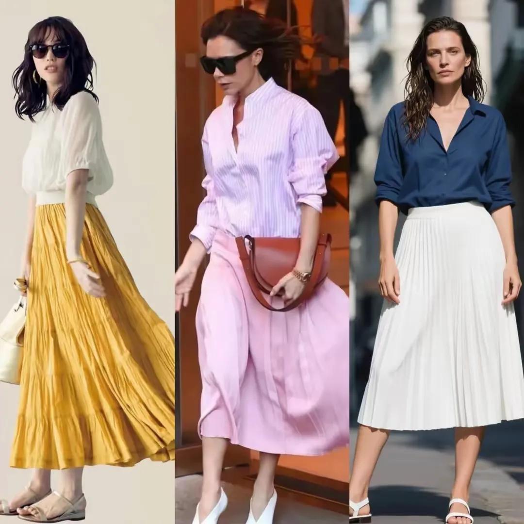 如果想要在这个夏季凸显自己的独特之处,我们还可以选择低饱和度的衣服颜色来穿搭,例如下面用新色的衬衫搭配上黄色的半身裙,或者是选择紫色的条纹衬衫,搭配粉色的伞状半身裙,这样的穿衣配色比较修饰,肤色显白显嫩显年轻,而且也没有刻意装嫩的嫌疑。